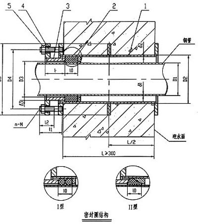 本公司生產(chǎn)的柔性防水套管是根據(jù)建筑科學(xué)研究院研制設(shè)計的S312/02S404標準圖集制造的。柔性防水套管主要用于管道穿過墻壁之處受有振動或有嚴密防水要求的構(gòu)筑物,柔性防水套管穿墻處之墻壁,如遇非混凝土?xí)r應(yīng)改用混凝土墻壁,而且必須將防水套管一次凝固于墻內(nèi);柔性防水套管廣泛用于建筑、化工、鋼鐵、自來水、污水處理等單位。