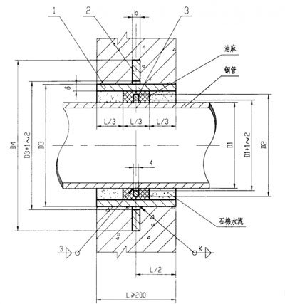 剛性防水套管適用于管道穿墻處不承受管道振動(dòng)和伸縮變形的構(gòu)(建)筑物,A型適用于鋼管。從圖中可以看到套管的管材厚度為δ,套管的外徑為D3,所穿的鋼管的外徑為D1。對(duì)應(yīng)于A型剛性防水套管的各個(gè)部位的尺寸。舉個(gè)例子,DN50的A型剛性防水套管,它的外徑為D3=114,而能夠穿的鋼管的外徑為D1=60。再舉個(gè)例子,DN80的A型剛性防水套管,它的外徑為D3=140,而能夠穿的鋼管的外徑為D1=89。鋼管的公稱直徑與外徑的對(duì)照表,DN50的鋼管的外徑為57(B型),DN80的鋼管的外徑為89(B型)。(注:B型指國內(nèi)沿用系列<公制管>)